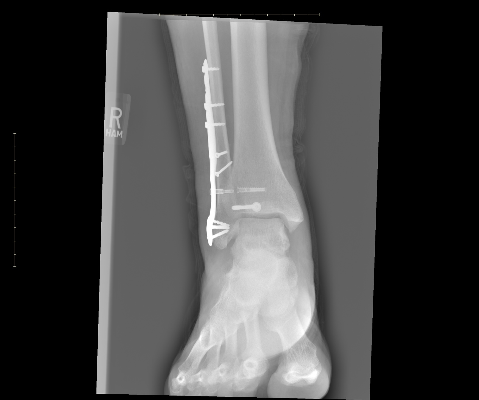 - X-ray of the realigned bones and joint with three pieces of hardware and lots of screws!